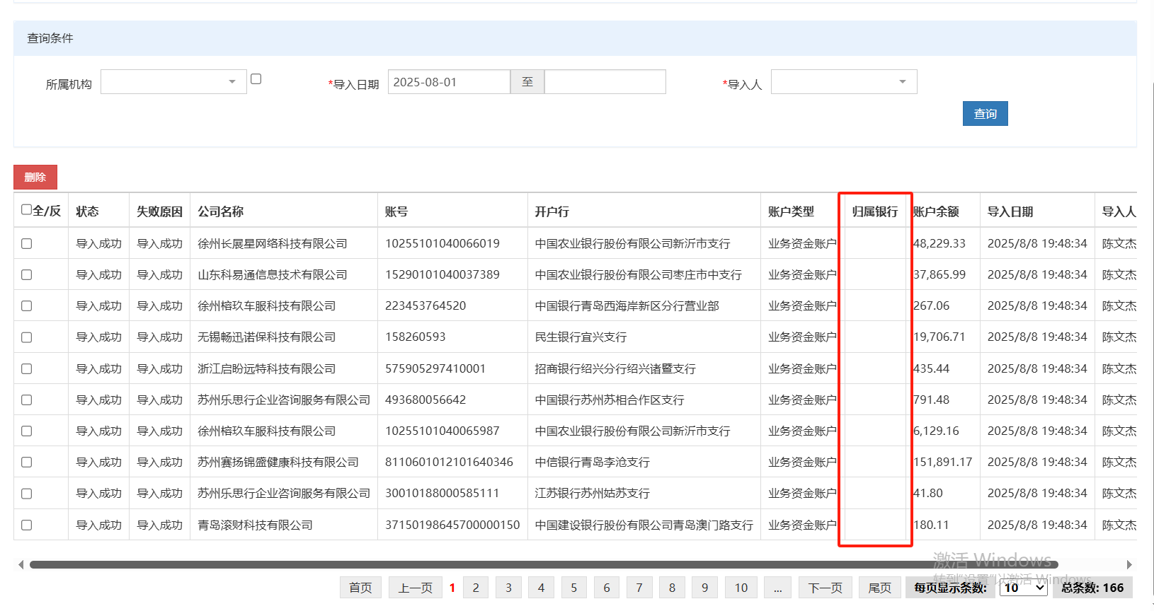 财务将公司信息导入系统,在模板中填写了归属银行一列,但是在系统中不显示,需处理