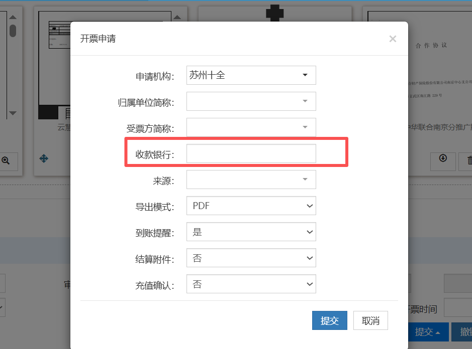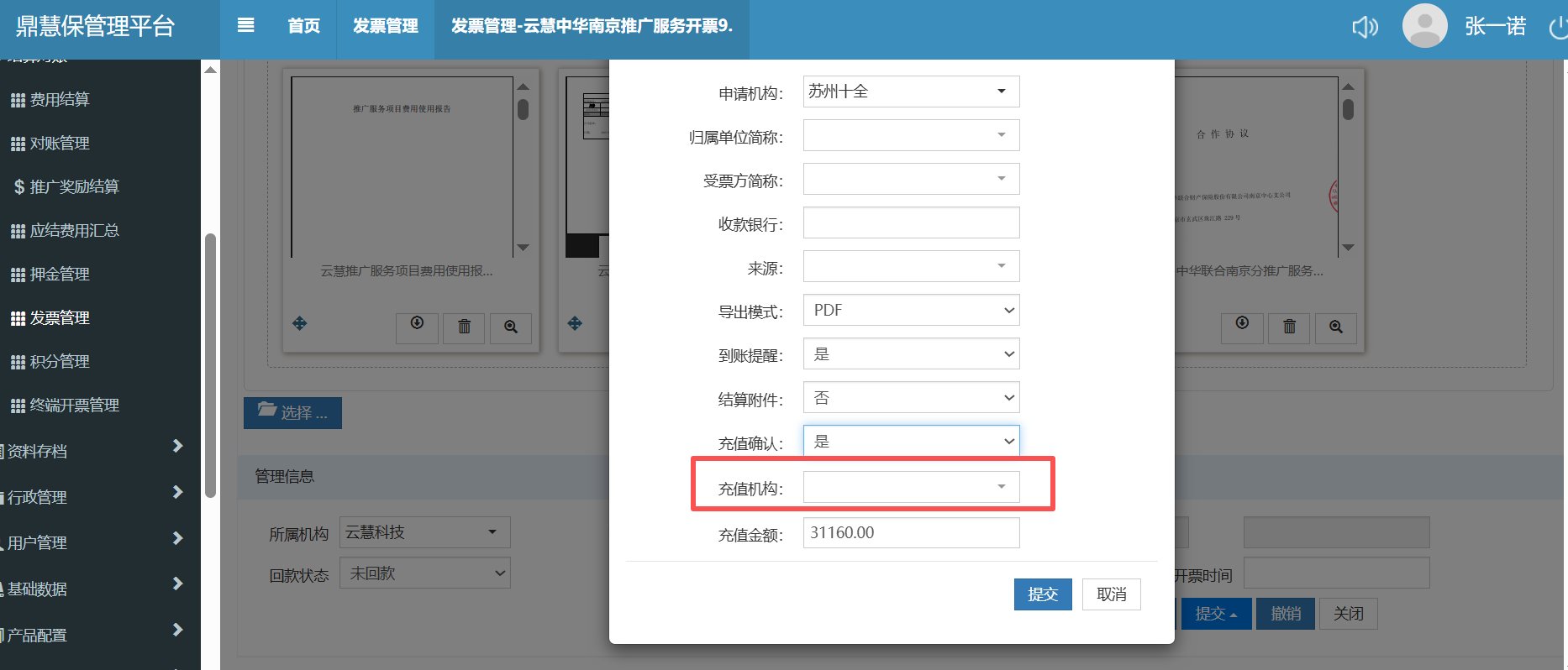 1.【鼎慧保管理平台】发票管理提交发票时,去掉收款银行一栏(见图1)2.提交发票时,弹窗充值机构默认选择填充上方结算单数据的机构(可以更改)(见图2,3),例如结算单数据是云慧中华南京这个机构,则提交发票申请时,选择充值:【是】,默认填充带出来的是云慧中华南京,但也是也可选择更改的