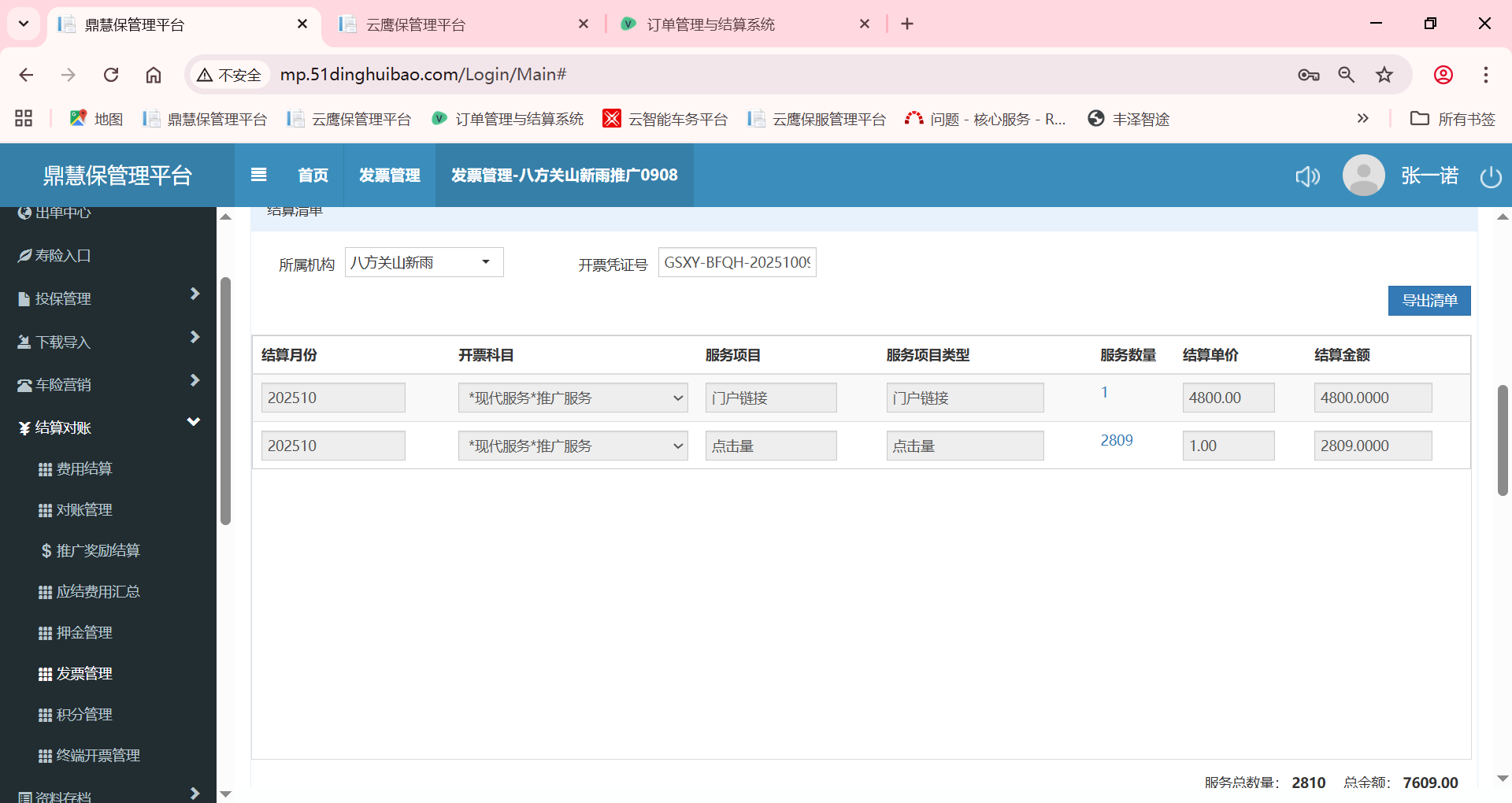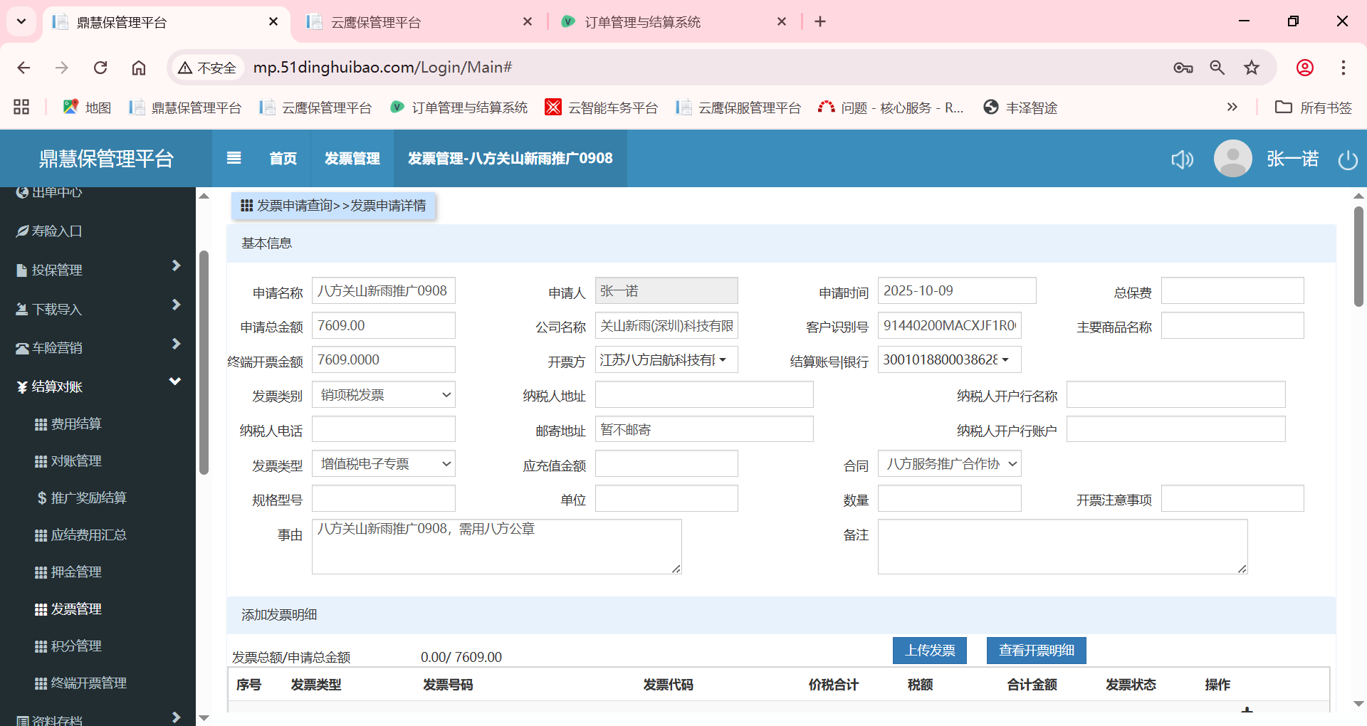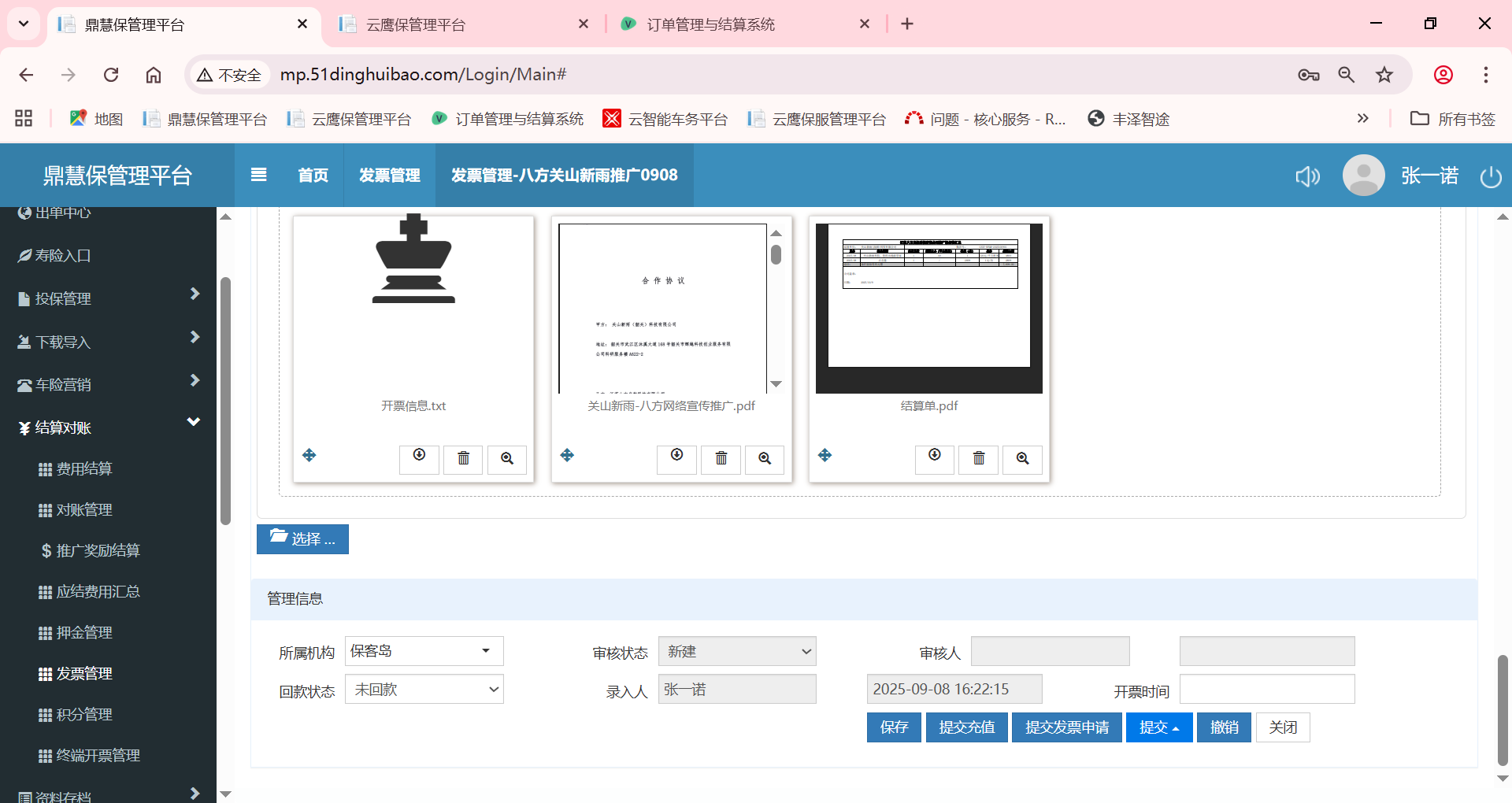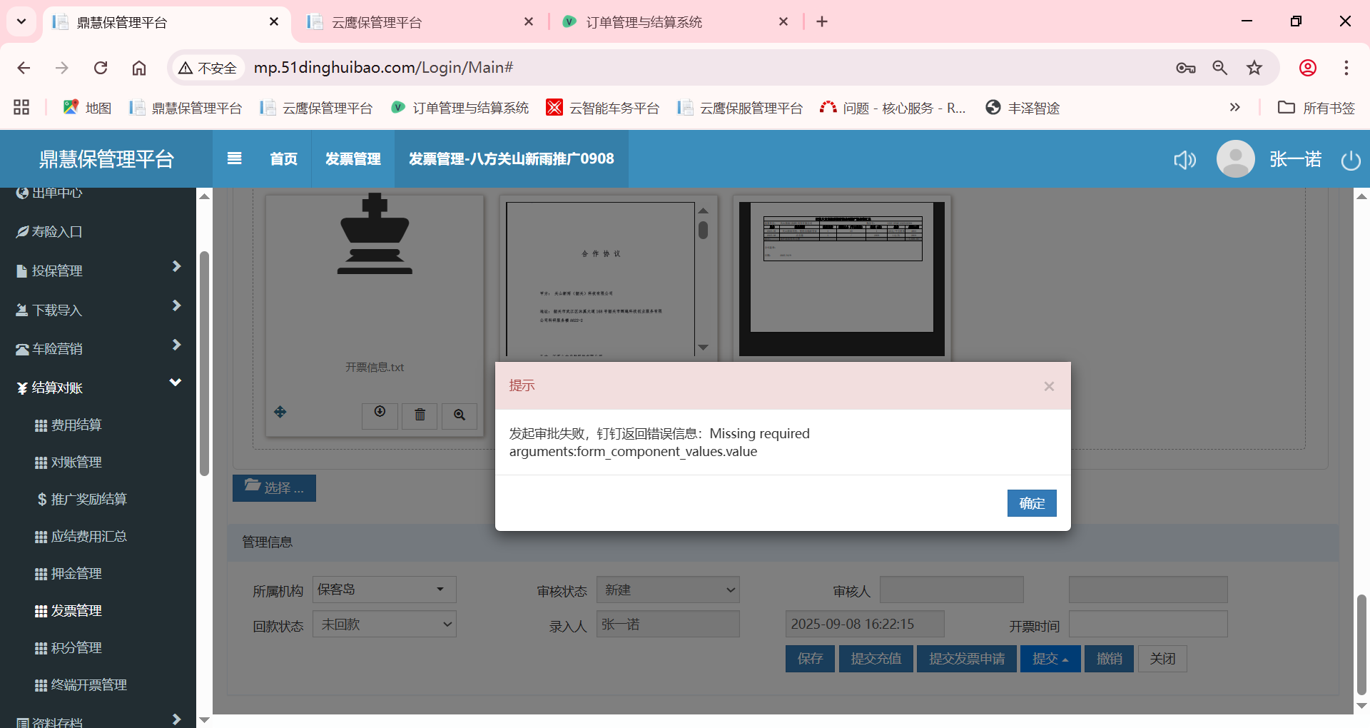 【鼎慧保管理平台】发票管理-关山新雨开票信息名称更改后,更改结算单号,重新提交钉钉提交不上去