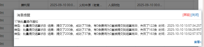郑州服务器 机构:义和中原(老黄河)在25.10.10导入费用结算453条, 费用结算提交待支付至流水时,系统右下角报错 ,具体错误如图所示。结果显示成功了部分流水,但是一条都查不到。