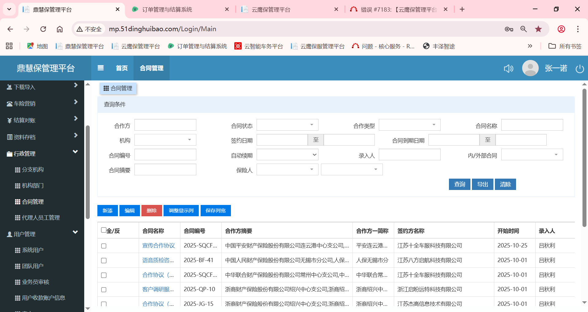 【鼎慧保管理平台】行政管理-合同管理界面,上方搜索栏可以根据签约方进行查找合同