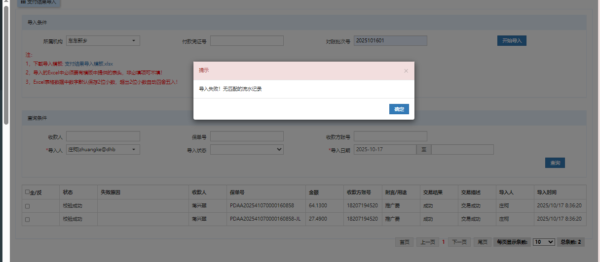 系统:鼎慧保机构:车车新乡问题:10.16日晚用支付结果导入功能匹配76条流水,成功28条,剩余48条都无法匹配,现需要支付结果用来反馈求方法。