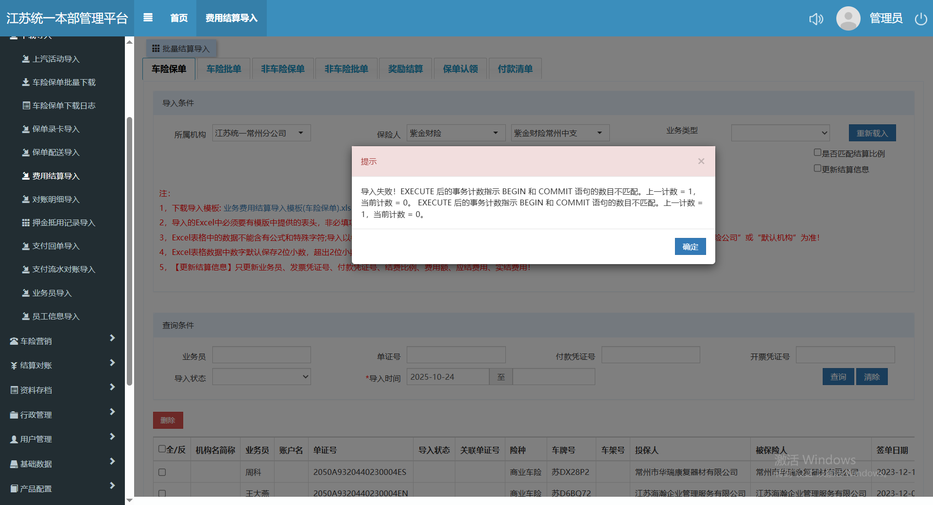 费用结算导入导入数据时,出现:导入失败!EXECUTE后的事务计数指示 BEGIN 和COMMIT 语句的数目不匹配。上一计数 =1,当前计数=0。EXECUTE后的事务计数指示 BEGIN 和COMMIT 语句的数目不匹配。上一计数=1,当前计数 = 0。的提示,结算单无法导入 需处理