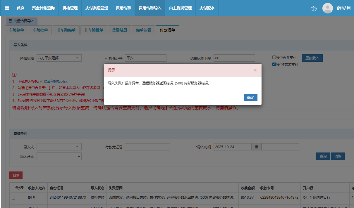 【付款清单】修改报错提示:远程服务器返回错误:(500)