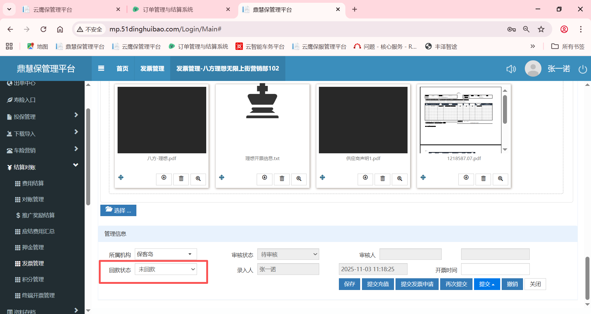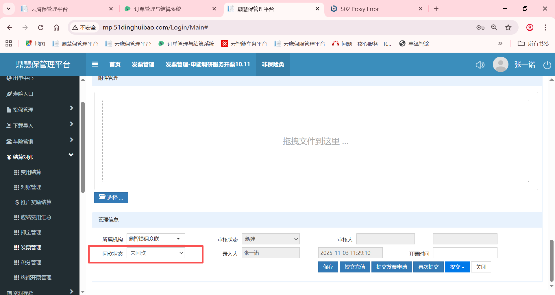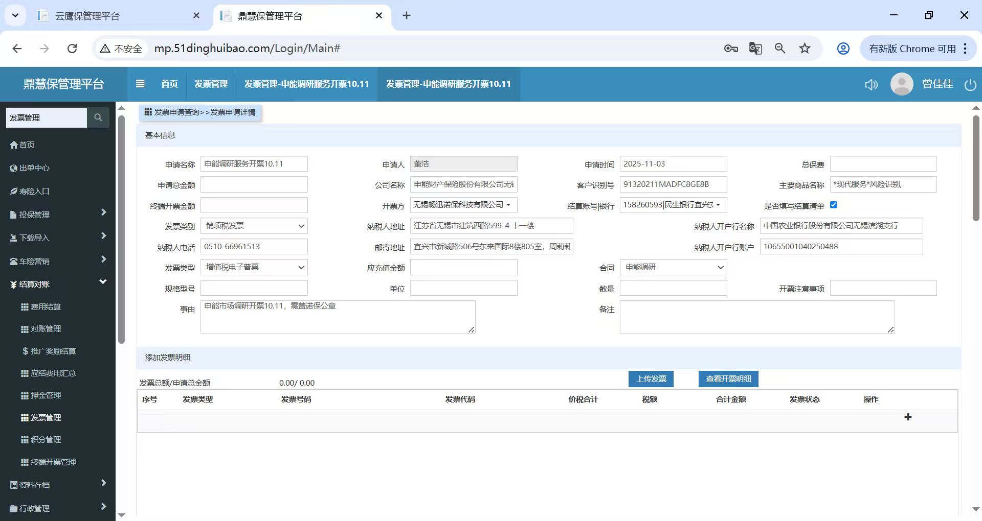 【鼎慧保管理平台】发票审批新增按钮再次提交时申请人员需要根据登陆账号的不同进行变动保持一致