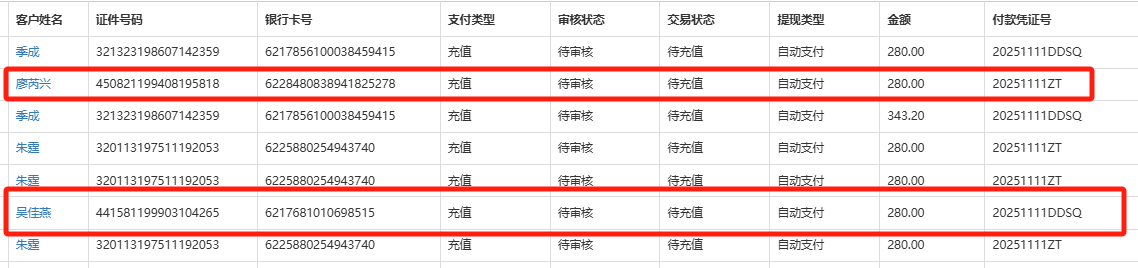 第一次进行【付款清单】匹配时报错(见图1)查询未生成分配记录第二次只导入附件中表格前两行,【自主提现管理】分配记录中却出现其他付款凭证号的收款人(见图2)且付款凭证号与附加模板中不一致