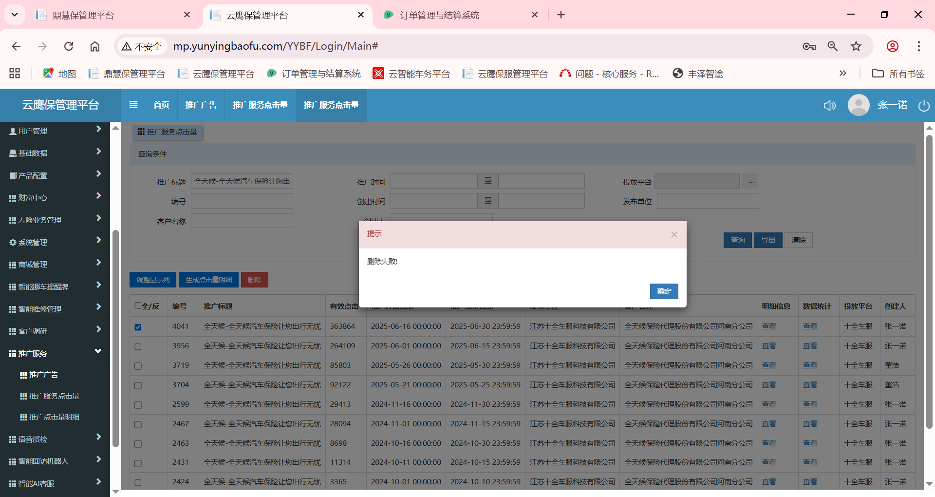 【云鹰保管理平台】推广服务-推广服务点击量删除点击量失败