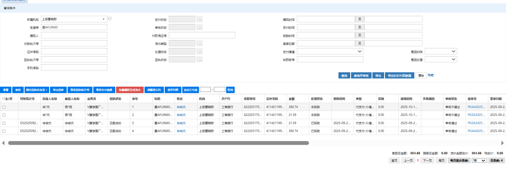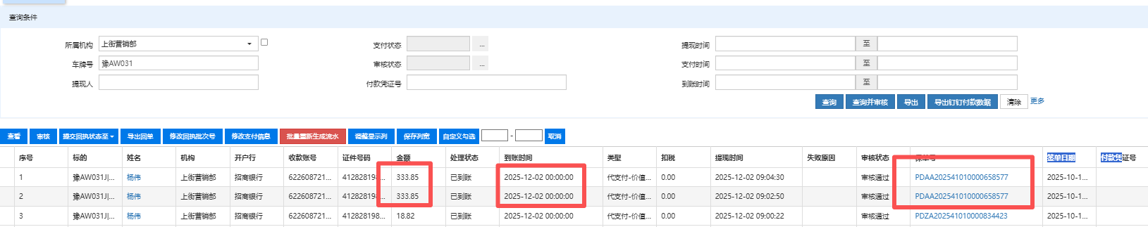 问题2.郑州服务器 上街营销部 PDZA202541010000795346和PDAA202541010000625977 豫AFU9660 已经支付过了,系统还可以生成未到账 待审核的流水,发现后手动修改倒审核不通过了,需查明原因,杜绝再次出现重复保单号问题