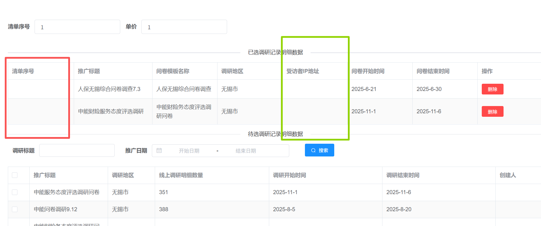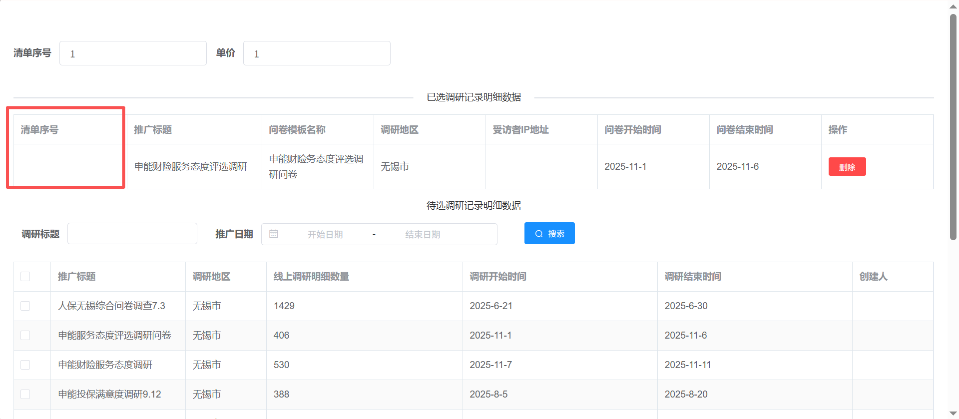 【订单管理与结算系统】市场调研-客户调研,业务数据导入,输入清单序号和单价,选择对应问卷后,清单序号无法填充见附件红框另,把附件二绿框不要显示