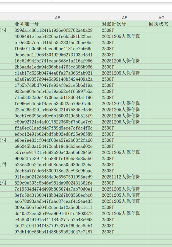 人保信阳电销对账批次号原本为日期+人保信阳,在没有操作对账的情况下,进入对账中状态,最后对账批次号修改为2508T(需要查询一下为什么会修改,是有人在操作嘛还是系统自动),影响支付结果匹配