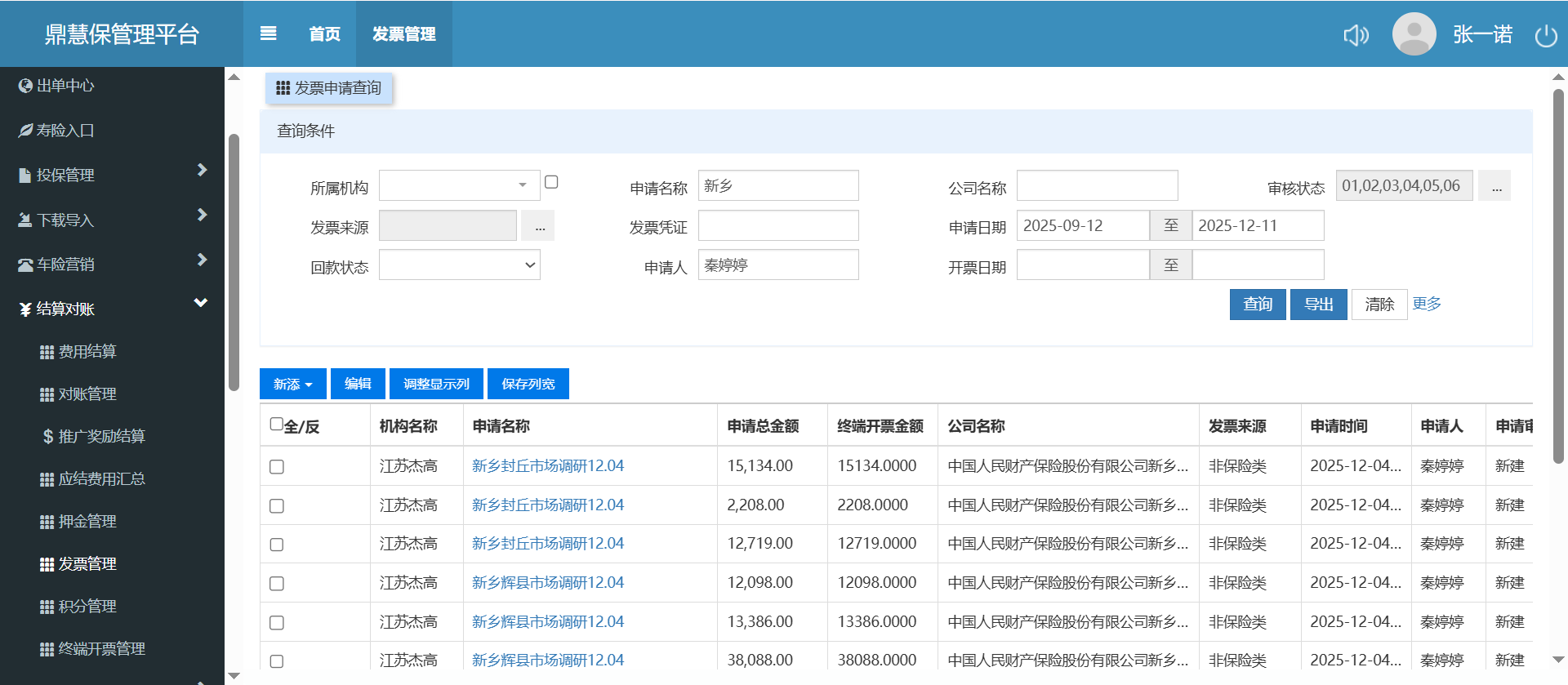 【鼎慧保管理平台】发票管理申请名称搜索【新乡】,申请人搜索【秦婷婷】,查找出来12条开票申请中的申请人改为曾佳佳