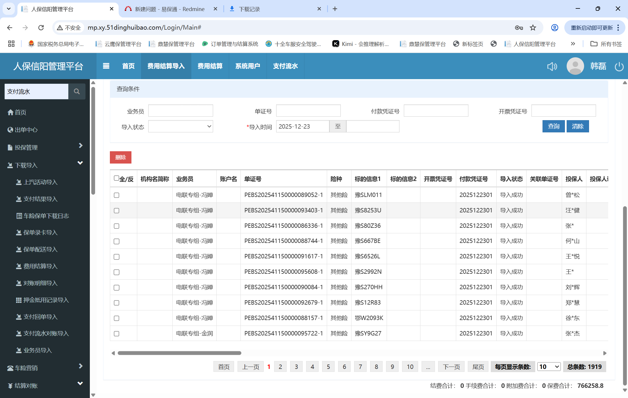 人保信阳服务器,费用结算导入1919条数据,费用结算页面生成2458条数据,数据有重复显示的错误,但生成流水后无重复。费用结算页面数据重复显示问题