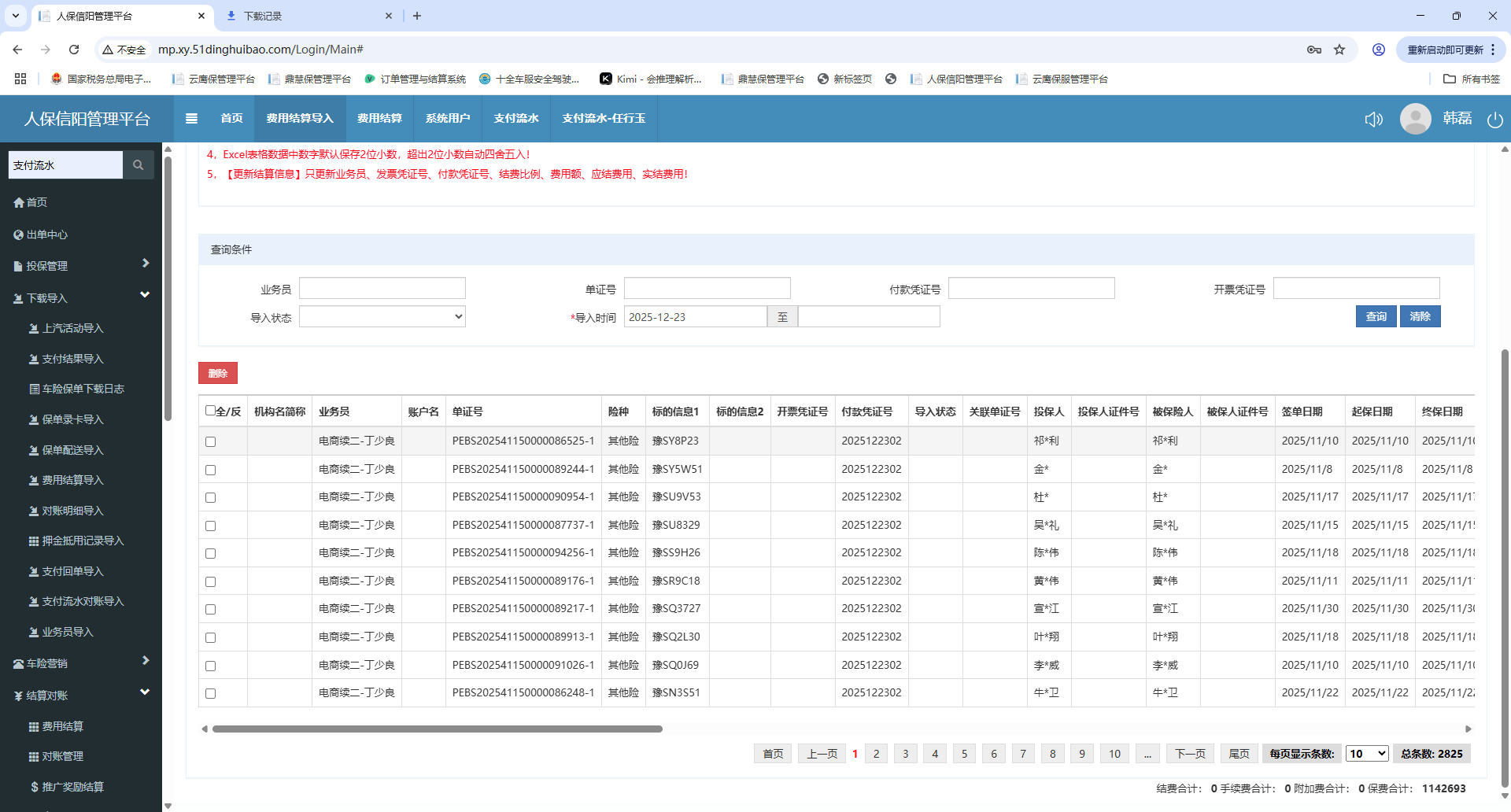 付款批次号2025122302,费用结算导入2825条,费用结算显示3390条