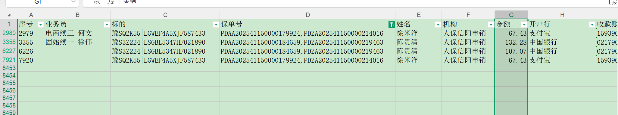 1.信阳服务器支付流水导出表格中,存在重复保单号一致,收款人一致
