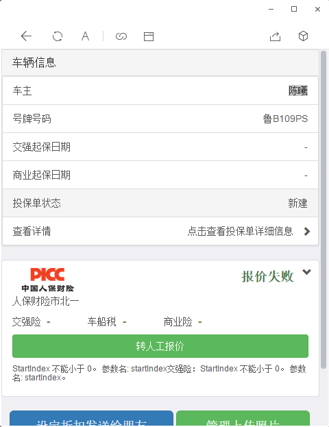 【海林】人保,个别车,微信报价提示“StartIndex 不能小于 0。 参数名: startIndex交强险:StartIndex 不能小于 0。 参数名: startIndex。”