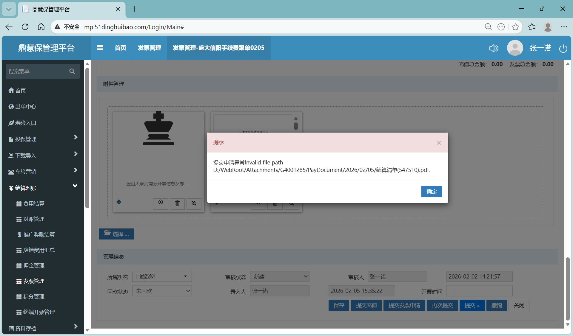 【鼎慧保管理平台】发票管理-盛大信阳手续费跟单0205提交开票时,勾选生成结算单,填完受票方和归属单位,充值金额后,提交不了,如图