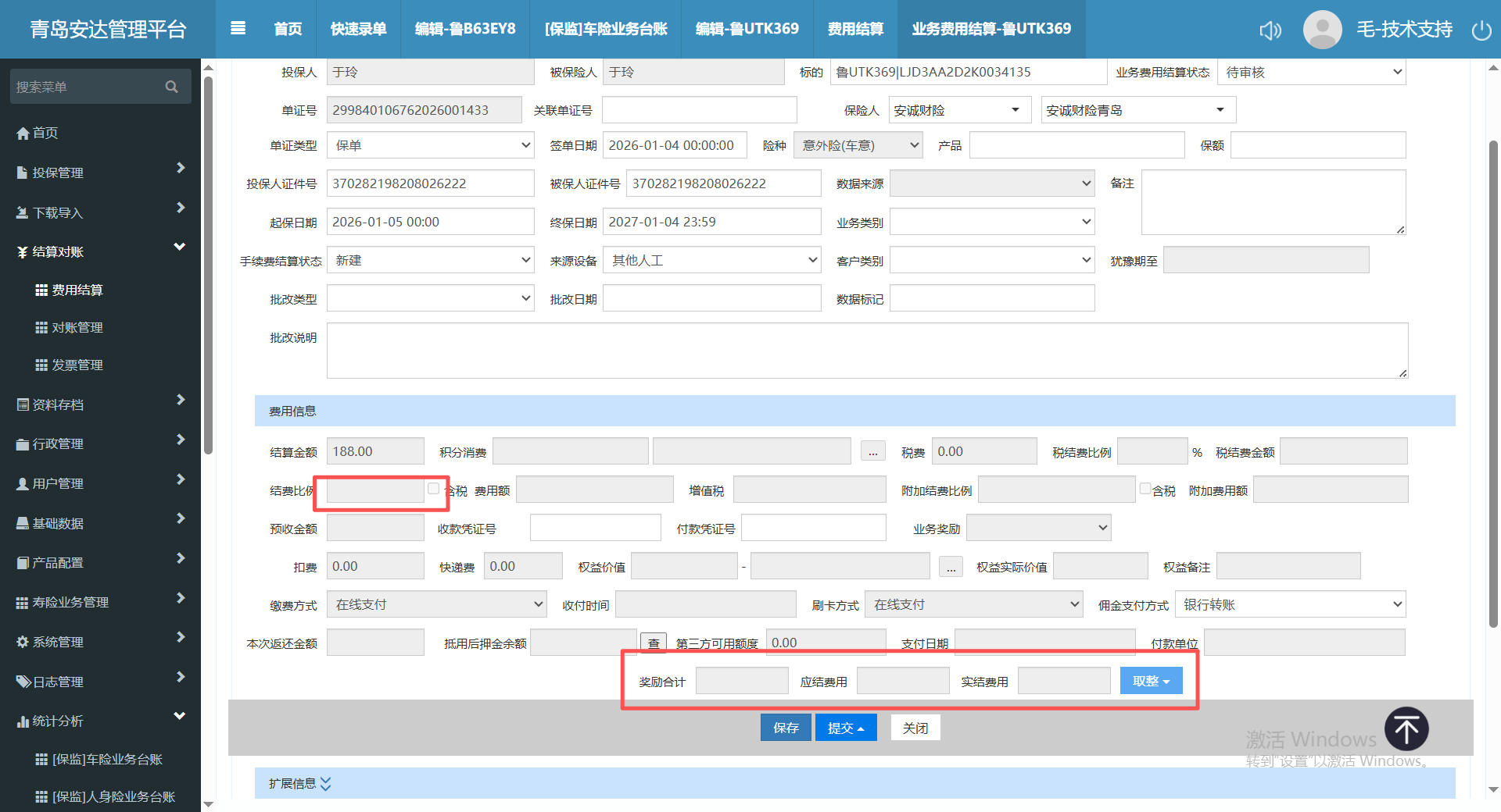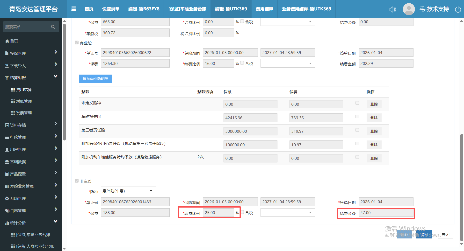 安达的老师在快速录单中录入非车险,填写了结算比例、结算金额,但是在结算单中没有带出相关的比例及金额,导致在统计分析-车险业务台账中非车的佣金结算是0,需进行处理举例:鲁UTK369