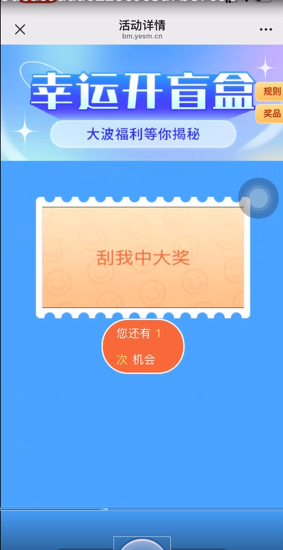 点击跳转到刮奖页面,用户进行刮奖。刮完奖后跳转展示获得的奖品。如果是实物,用户填写