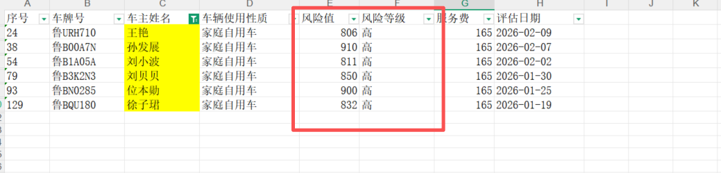 在订单系统走风险评估保存之后,云智能车务平台会对应生成风险值和风险等级,将一下人员的风险值和风险等级修改为高风险,1.徐子珺 鲁BQU180 2.位本勋 鲁BN0285 3.刘贝贝 鲁B3K2N3 4.刘小波 鲁B1A05A 5.孙发展 鲁B00A7N 6.王艳 鲁URH710 查询条件:SZRES-BHQDF-2026012001