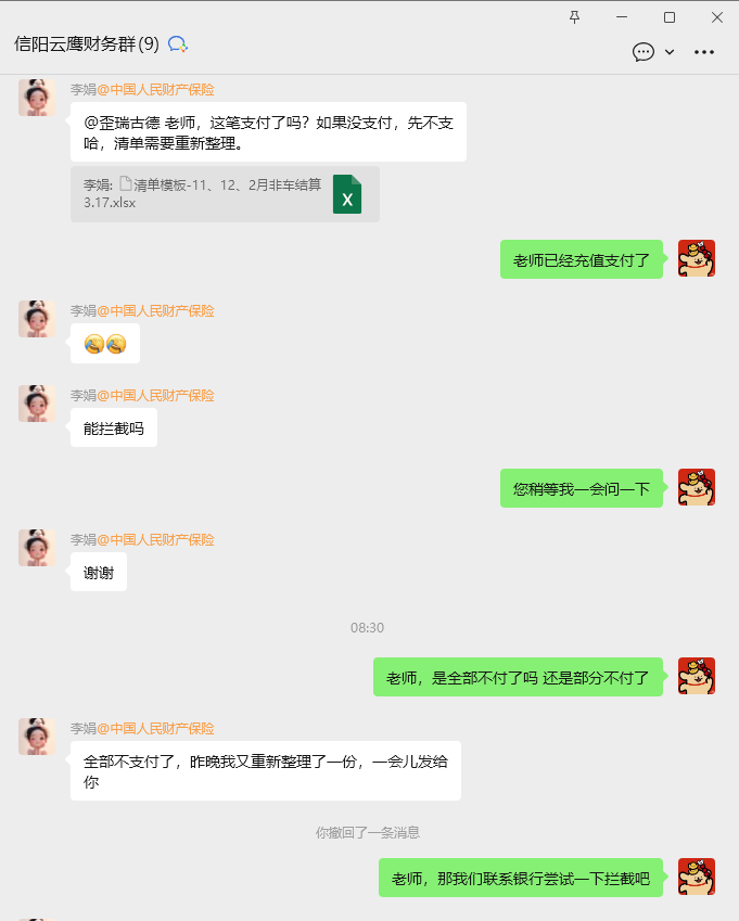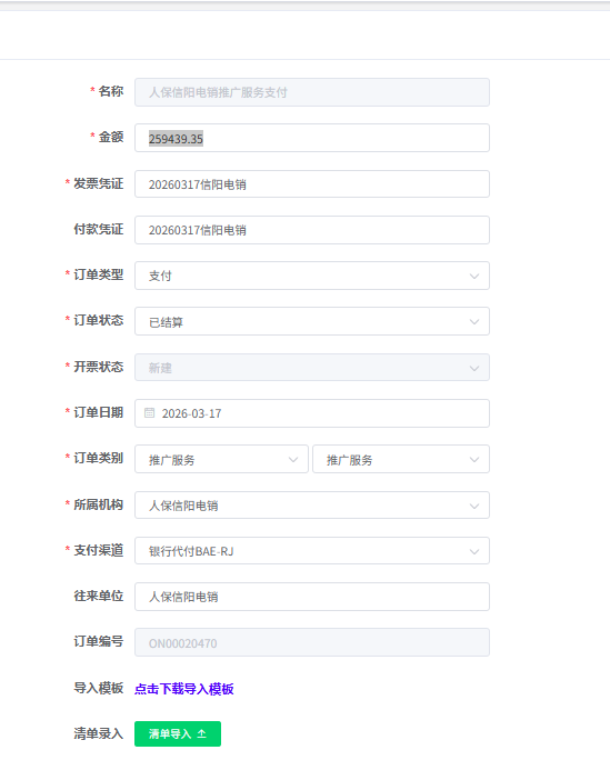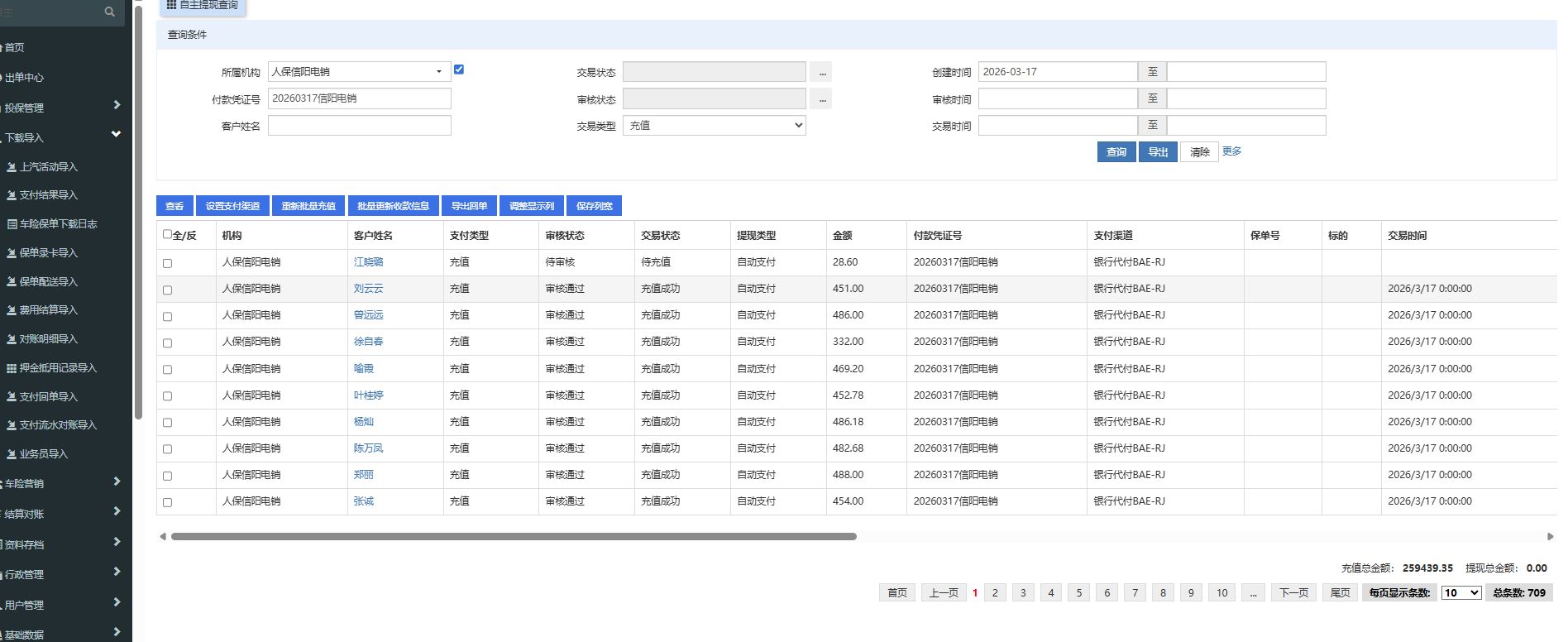 因客户原因,支付清单需重新整理,需从充值中退款,详情见图人保信阳电销,自主提现管理 付款凭证号20260317信阳电销 金额259439.35