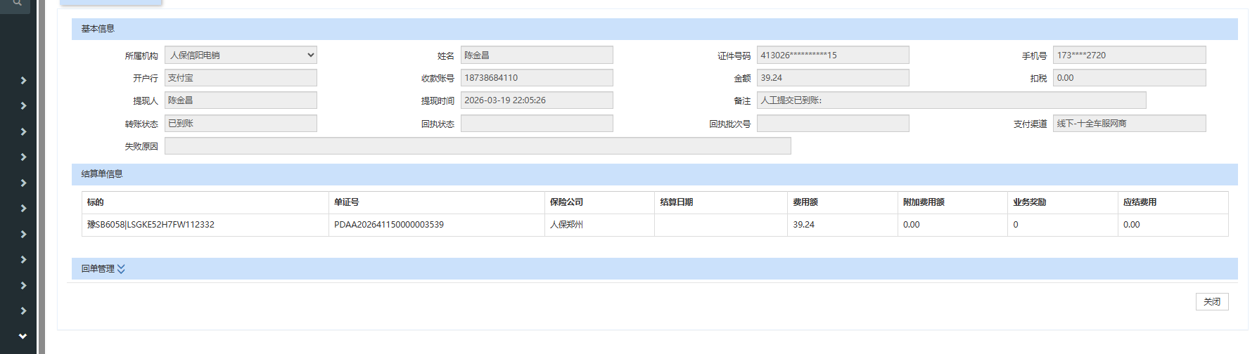 保单号PDAA202641150000003539,未修改支付渠道导入支付结果,需由是线下-十全车服网商修改为线下-榕玖网商