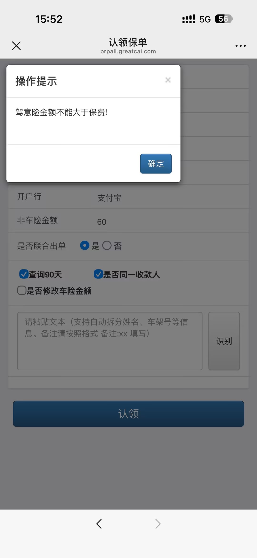 信阳有客户反应,认领时出现超非车险保费错误提示,但实际非车保费超过返佣的金额。请尽快查证解决。问题截图见附件