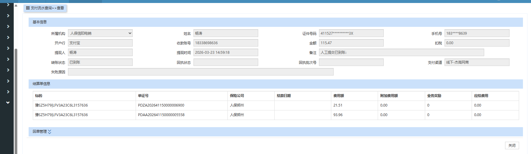 车牌号豫SZ5H79保单号PDZA202641150000006900,PDAA202641150000005558未修改支付渠道导入支付结果,需由是线下-杰高网商修改为线下-榕玖网商
