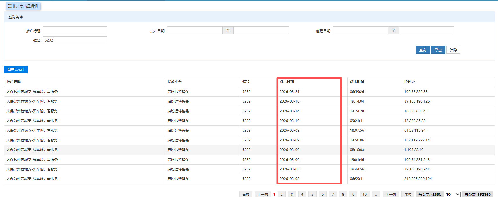 云鹰保推广服务,生成的点击量明细的日期需要正序排序