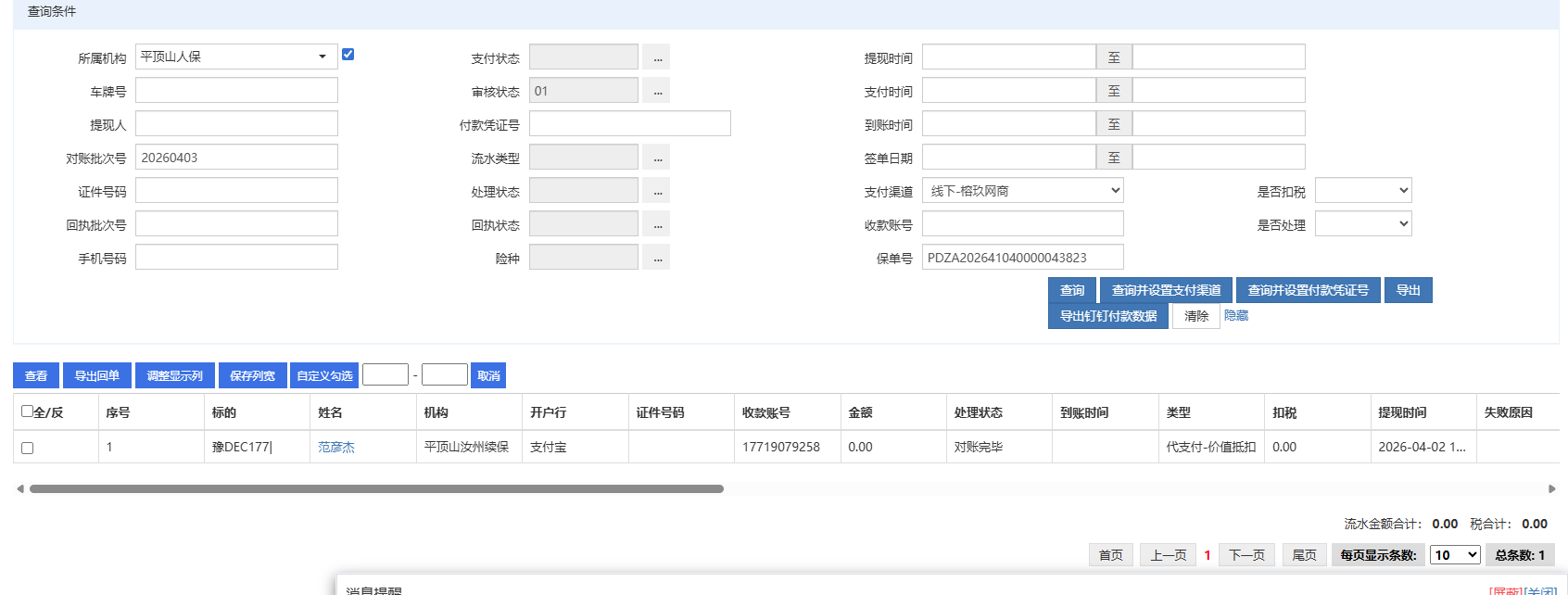 豫DEC177 PDZA202641040000043823 金额0 姓名范彦杰 平顶山汝州续保,未在客户所发的支付计划中,因金额为0没删除,对账完毕了,需改完未到账待审核状态