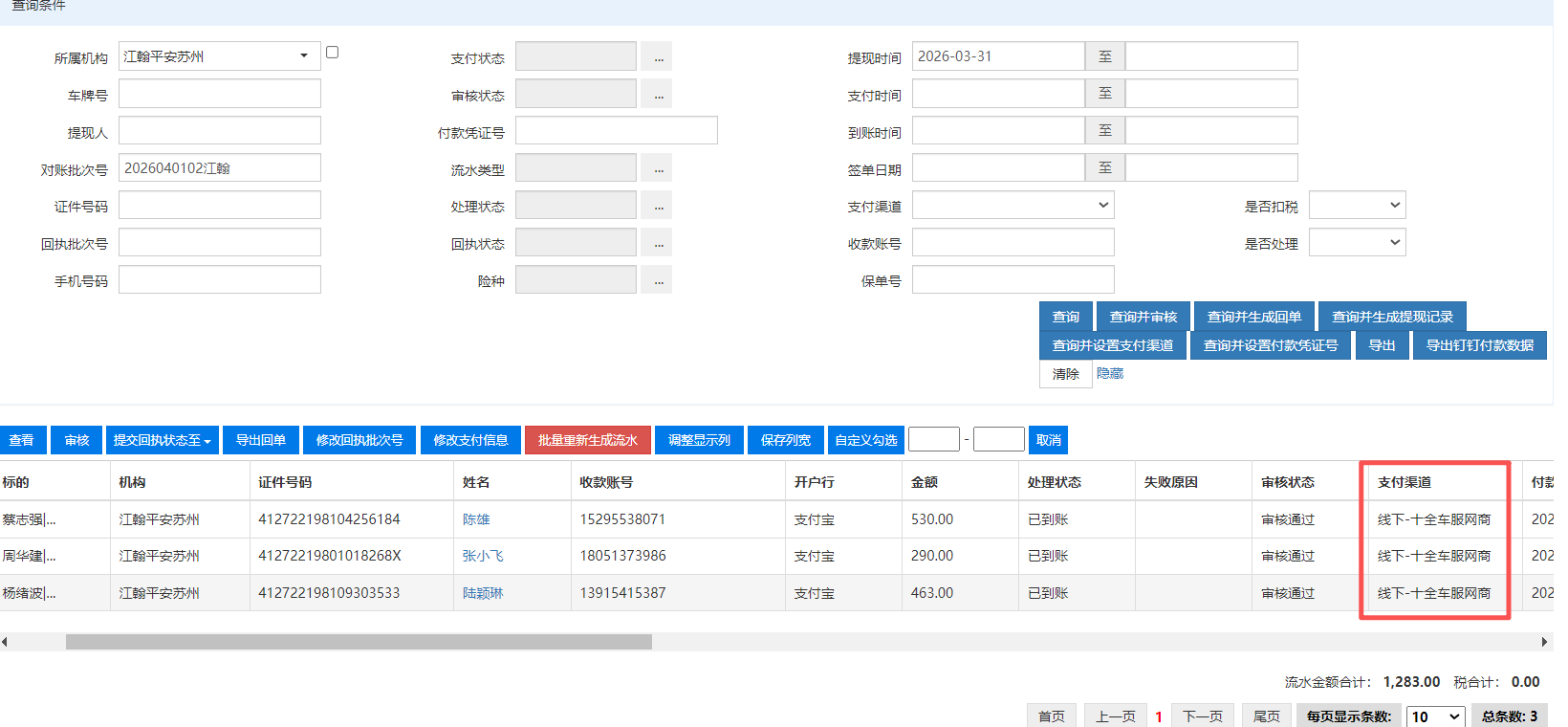 1.实际支付渠道应为【线下-榕玖网商】(见附件)2.网银4.1支付榕玖网商支付65803.72;系统4.2线下榕玖网商支付64312.12;网银比系统多支付1491.6,只找到问题1的1283