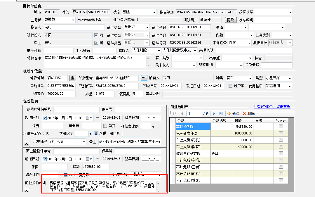 此车报价提示车型问题。平台返回车型与保险公司车型不符,在保险公司系统中可以进行报价。见附件