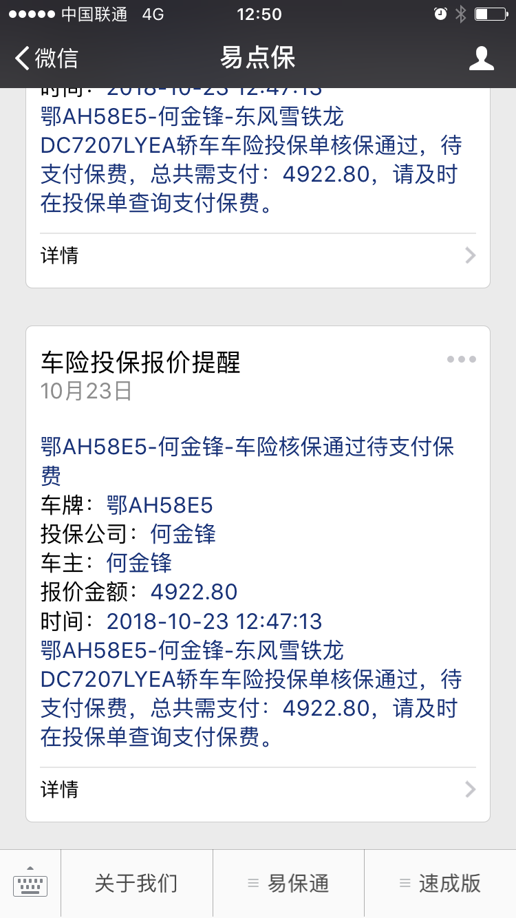 微信端接收到“核保通过待支付”的消息提醒后,点击进入详情页面长按支付二维码进行分享时,微信端才会跳出保险公司的二维码,导致整个操作有点繁琐。