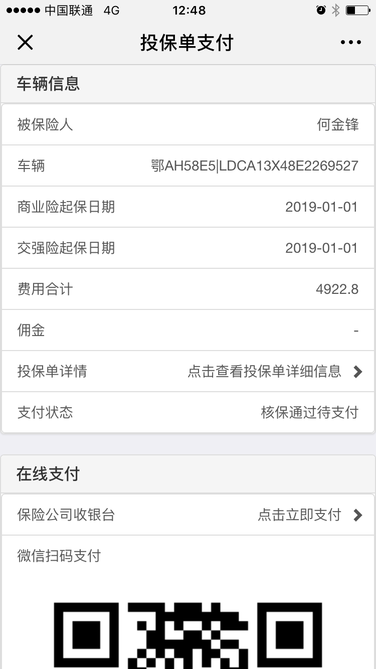 微信端收到“核保通过待支付”的消息提醒时,在详情页面应该只显示二维码一种支付方式,并直接显示出保险公司二维码。
