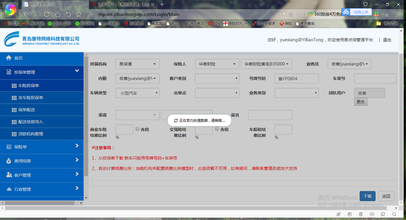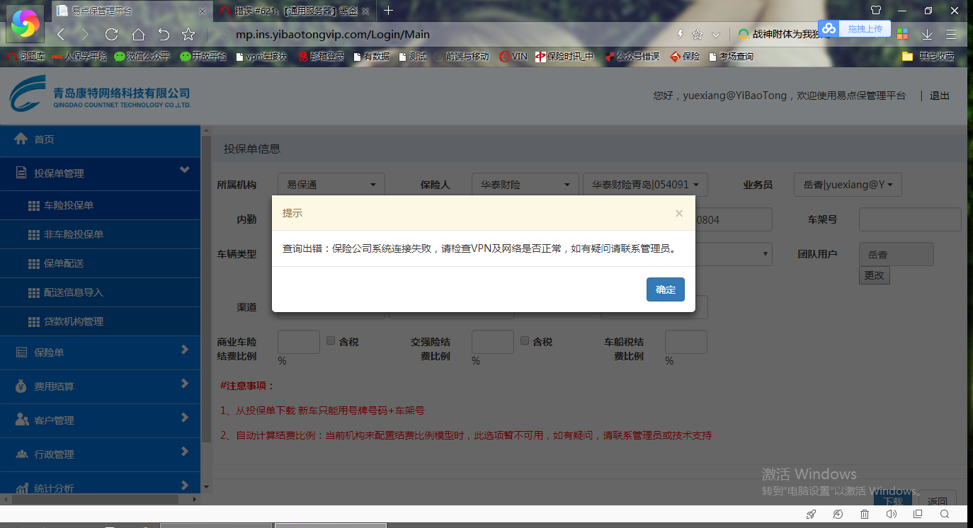 1、上述车在易保通B/S端下载投保单时,系统提示“VPN连接失败”点击【确认】后当前页面会一直处于数据加载的过程,需要刷新页面才能操作其他功能。