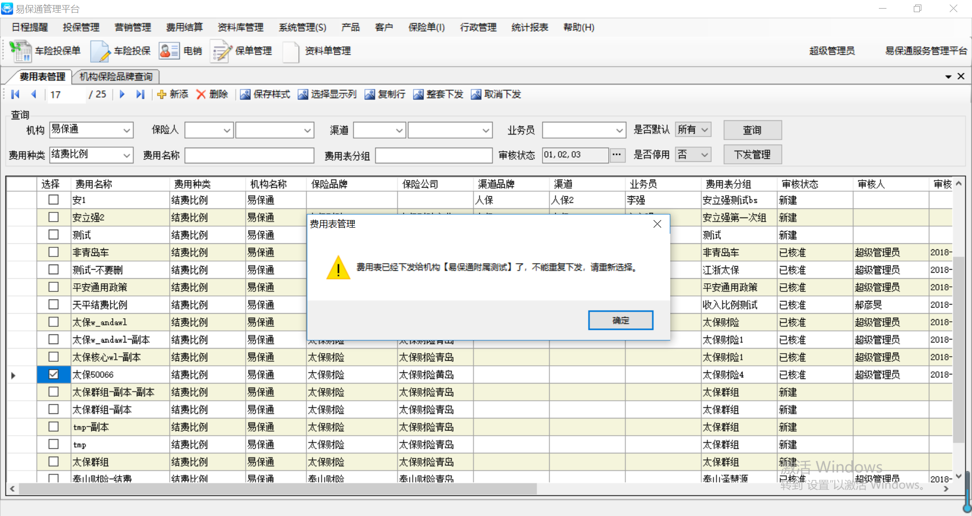 问题仍然存在。重现步骤:使用附图重复下发中框出的费用表,下发到易保通附属测试机构后。再次选择该费用表,点击整套下发,如果选择的机构是易保通附属测试,应该提示如附图1。但是仍然可以按照下发规则下发到其他机构