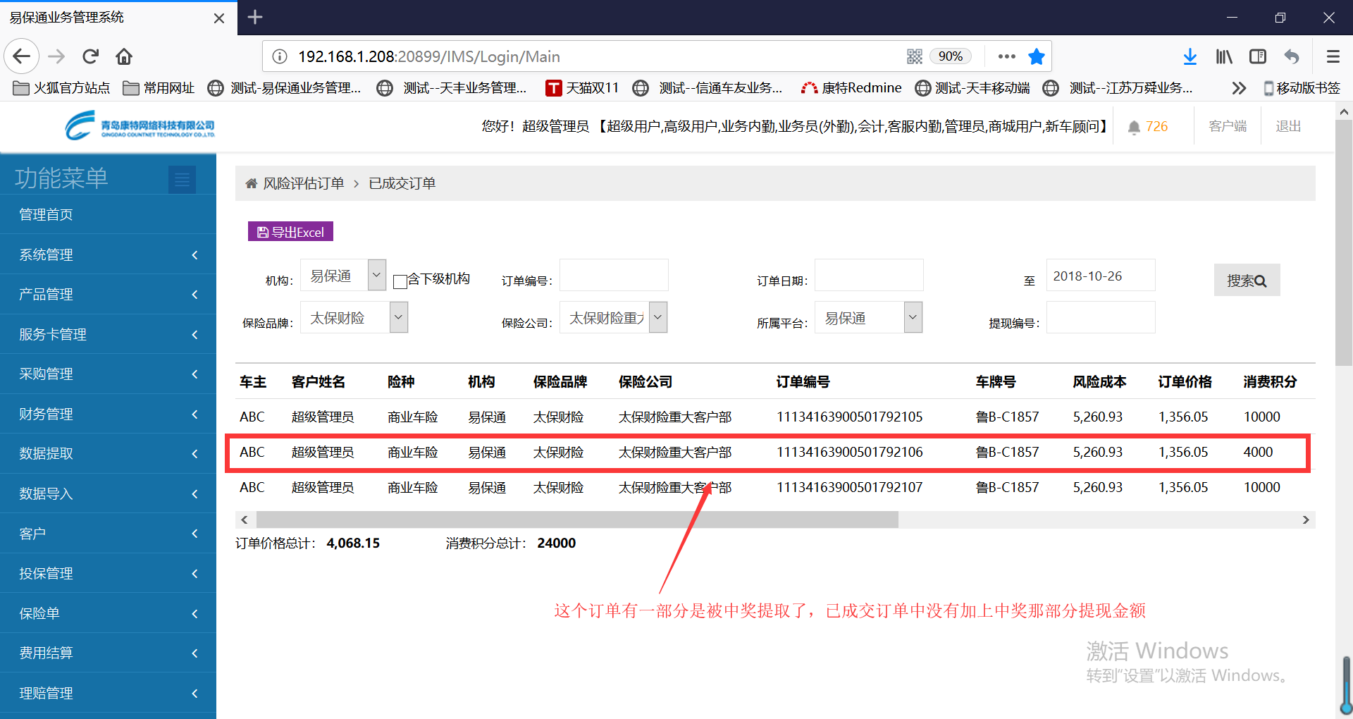 【信通车友】风险评估单,提现明细中有中奖,确认提现后,查看已成交订单中,中奖的订单积分没有更新