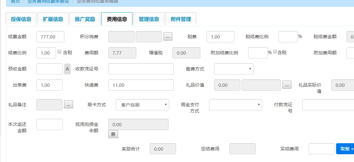 2. 点击修改/查看进入编辑页面:“结费比例”“费用额”“刷卡方式”仍为空