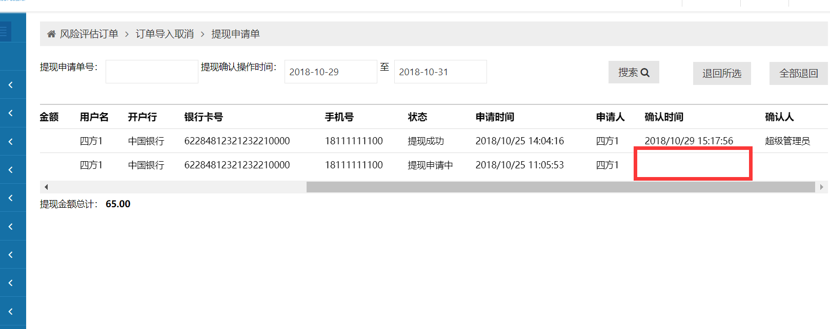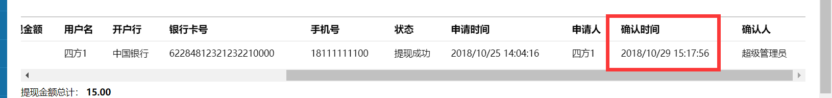 2. 提现申请没有确认时间时,应该不能搜出来,见附图3