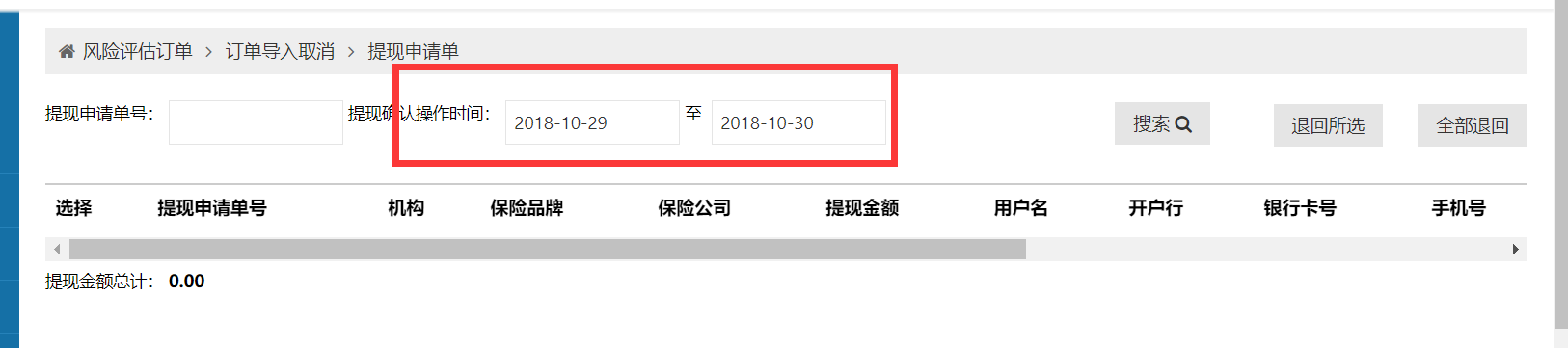 1. 提现确认时间为附图1,搜索条件为附图2,搜不出来。将结束时间改为10/31号能搜出