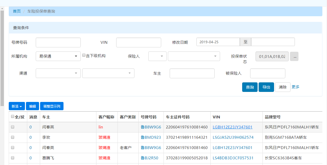 在所有查询列表页面都应该添加链接列,用于打开编辑页面,例如结算单、保单查询页面用保单号列、投保单用车牌号码列做链接列,点击时即可进入详情页面。