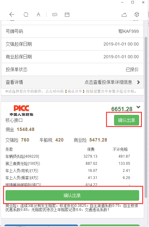 问题描述:在微信端报完价格后,第一次点击查看商业险明细页面会展示两个“确认出单”按钮,第二次再点击时系统才会正常显示,