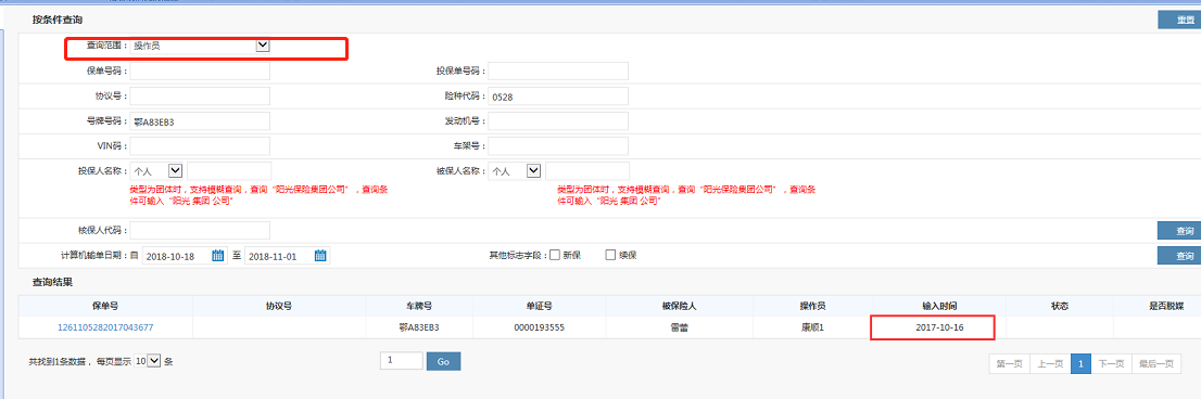 【捷顺】阳光扫描不到保单,保险公司系统中增加“归属机构”查询条件,需将查询条件设置为“归属机构”才可以查询到相应数据。