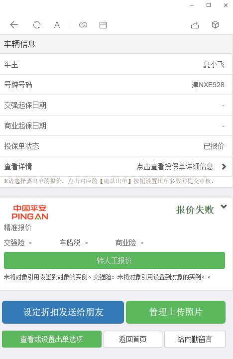 【华明】天津地区平安报价提示“未将对象引用设置到对象的实例”