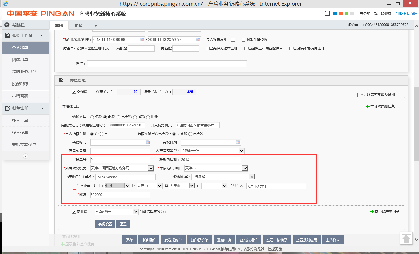 使用夏小飞车辆信息在易保通系统内报价时,系统提示“未将对象引用设置到对象的实例”,在平安系统内报价时勾选交强之后平安要求必须填写税款所属期、所属税负机关、车辆落户地址、车主手机号、燃料种类、车主地址以及邮编,填写上之后系统便能正常报价,请开发尽快安排时间排查平安无法报价的问题。