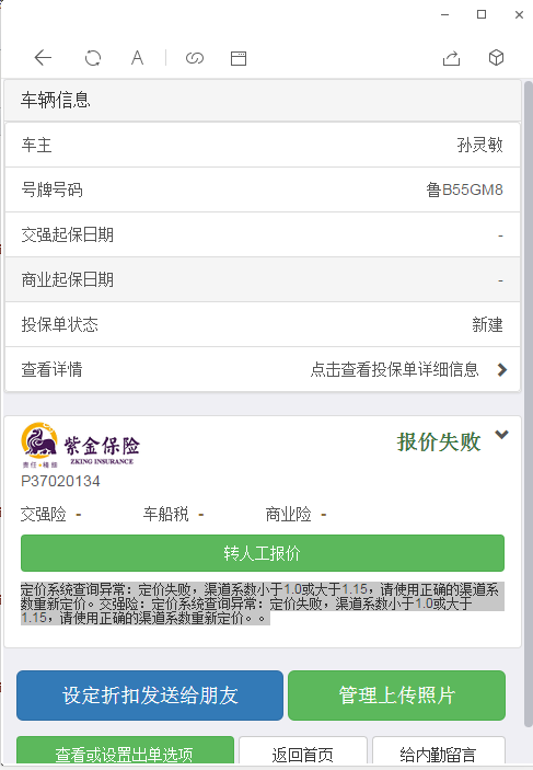 以上账号在报价车牌号:鲁B55GM8 报错:定价系统查询异常:定价失败,渠道系数小于1.0或大于1.15,请使用正确的渠道系数重新定价。交强险:定价系统查询异常:定价失败,渠道系数小于1.0或大于1.15,请使用正确的渠道系数重新定价。。