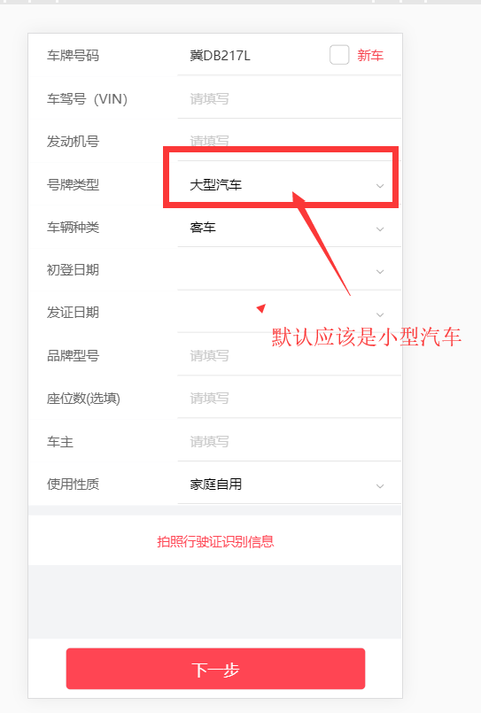 【信通车友】风险评估单,车辆信息页面,车辆类型需默认小型汽车