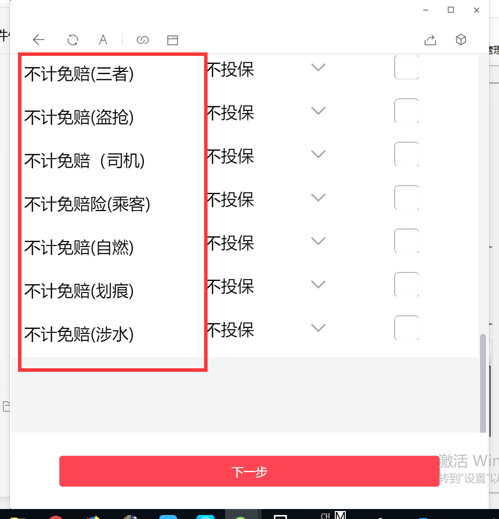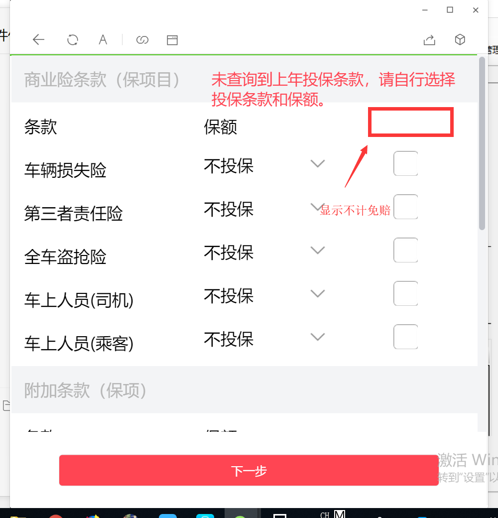 2. 不计免赔不应该在附加条款中,应该是险种后面的复选框。选中主险时不计免赔自动选中,也可单独去掉不计免赔。没有选择保险条款时,不计免赔应该不能选中