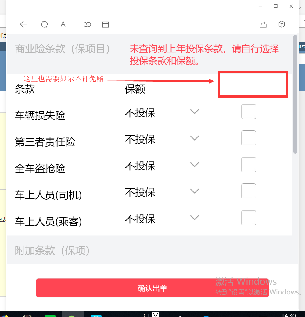 1. 转人工的商业条款选择页面,复选框的上面需要加上不计免赔四个字(主险和附加险都需要加)