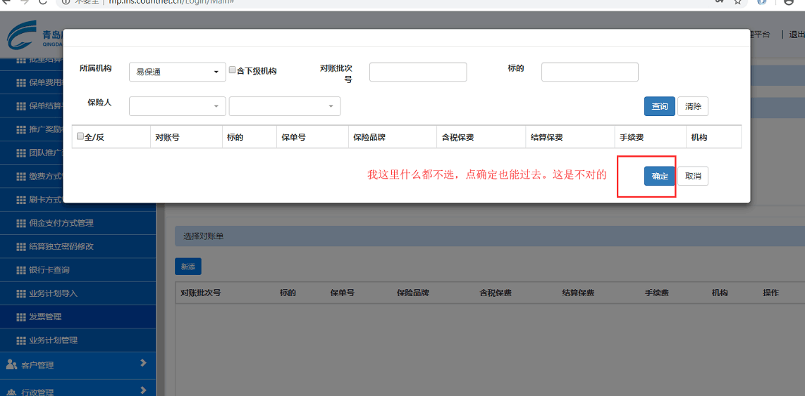 如果不选择任何数据点击确认的效果等同于取消。建议如果没有数据弹出提示框“至少选择一条数据”