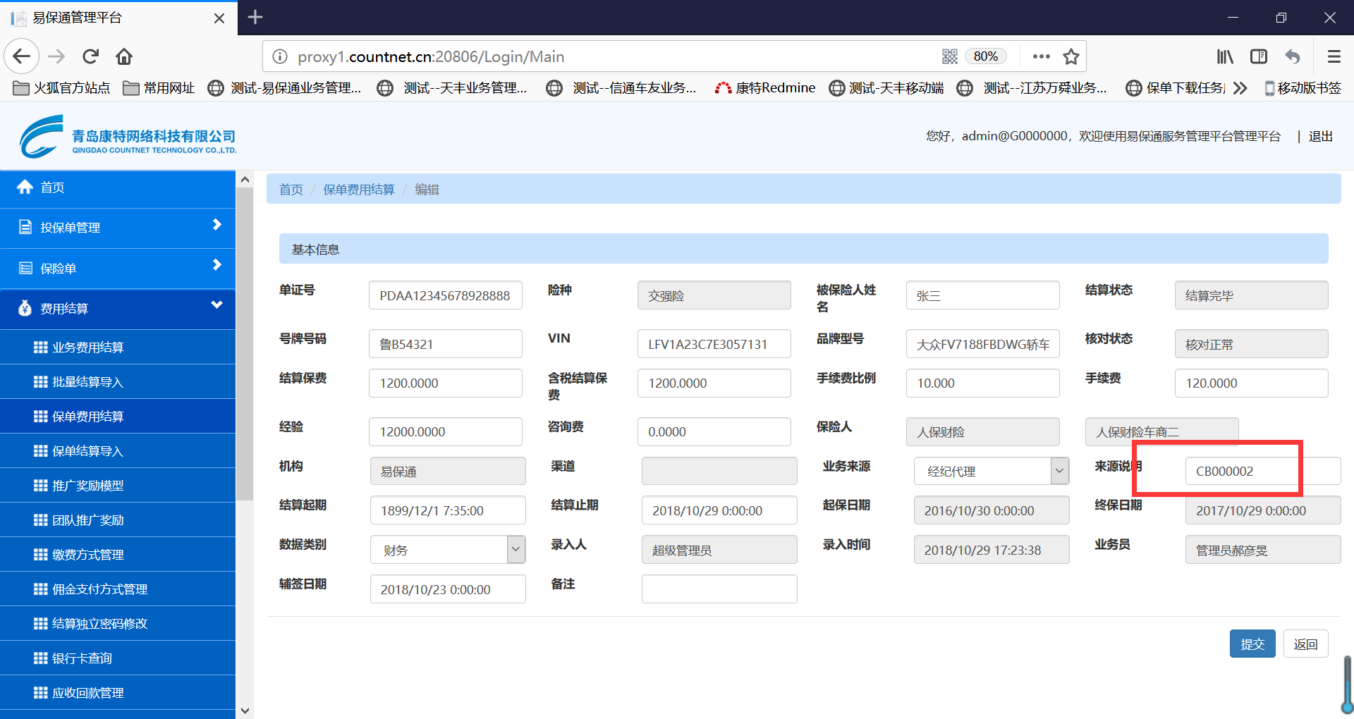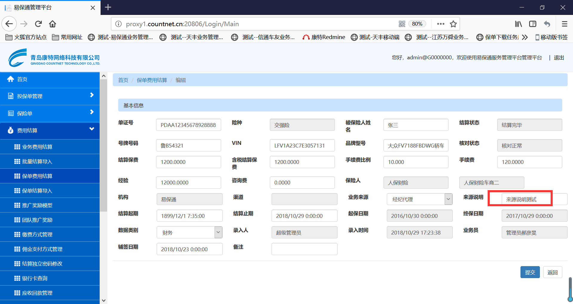 【速成高级版】保单费用结算,编辑页面输入来源说明,保存后显示错误